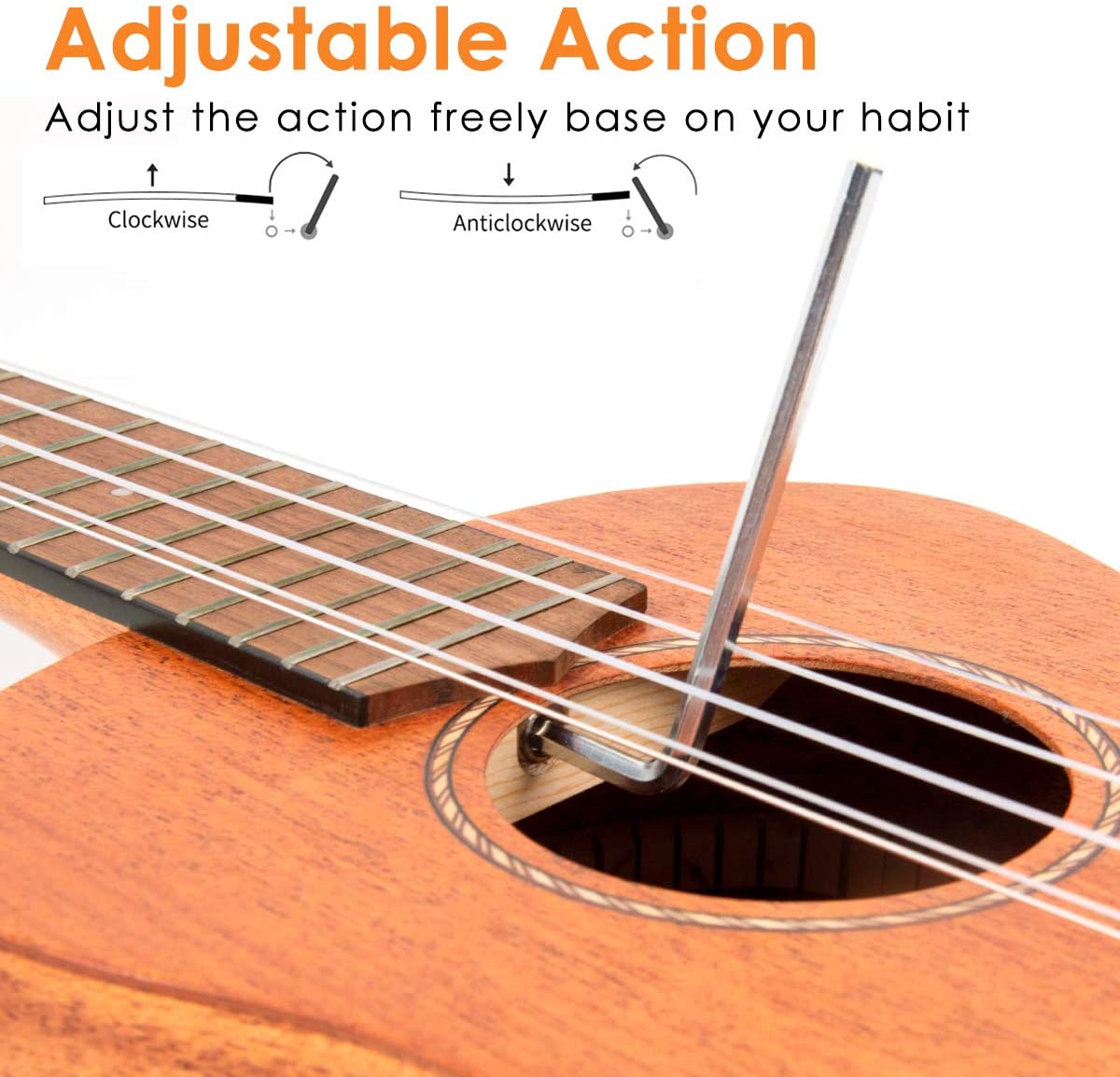 Adjustable Truss Rod:Built-in truss rod can balanced the tension caused by strings or temperature change shrinking, for a straight and durable neck. The adjustable 8 string ukulele neck allows your hand to stay in a comfortable position by keeping the strings in a perfect height. Smooth Walnut Fretboard : Come with the fretboards surprisingly smooth on every sides detail, you can roll over the frets and do not need to worry be scratched. |
